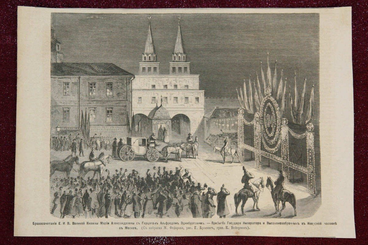 Гравюра "Бракосочетание Е. И. В. Великой Княжны Марии Александровны с Герцагом Альфредом Эдинбургским. - Прибытие Государя Императора и Высоконовобрачных к Иверской часовне в Москве."